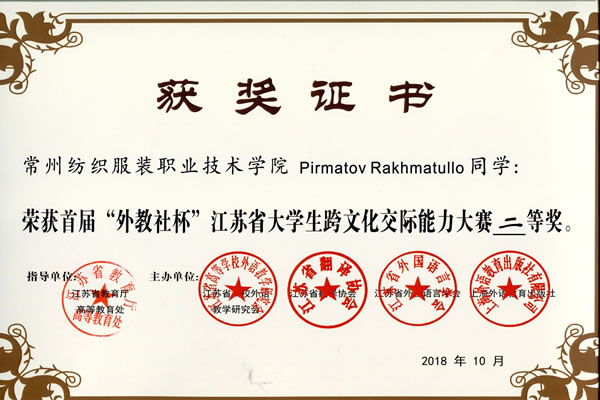 我校留学生PirmatovRakhmatullo(马小龙)在首届“外教社杯”江苏省大学生跨文化交际能力大赛中获得二等奖,指导老师孙宏、李丽明分获优秀指导教师奖。