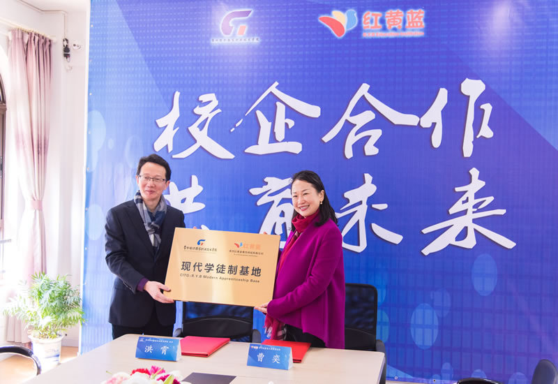 活动最后,洪霄与曹奕签署了“常纺·红黄蓝”订单培养协议,并举行了“常纺·红黄蓝现代学徒制基地”的铭牌授牌仪式。