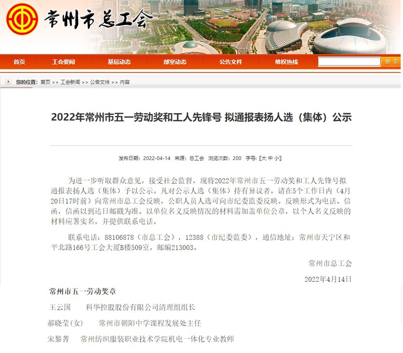 因其在教育教学实践中的优异成绩和突出表现,获2021年常州市“师德模范”、2022年常州市五一劳动奖章(公示期)荣誉称号。
