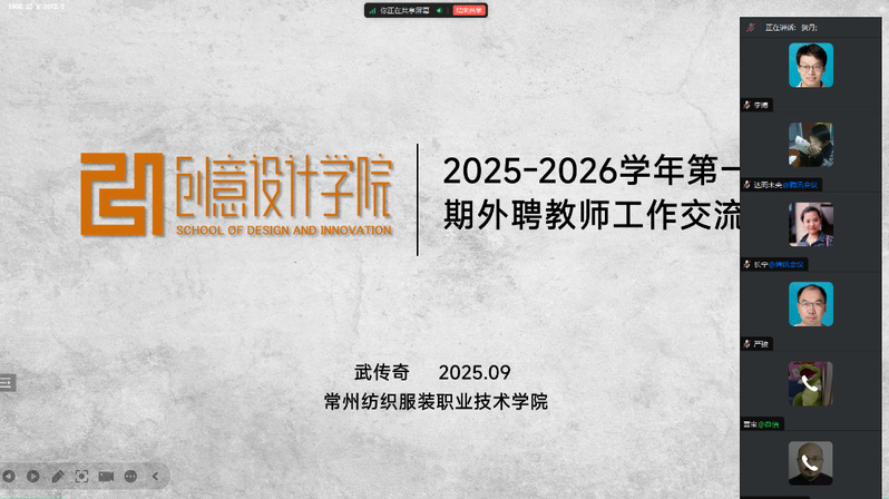 9月4日,创意设计学院在线上组织召开了2025-2026学年第一学期外聘教师教学工作研讨会。会议旨在进一步加强外聘教师队伍建设,规范教学管理,提升教学质量,确保新学期教学工作有序开展。会议由创意设计学院副院长武传奇主持,院教学督导贺丹、教学秘书王良惠、全体教研室主任及外聘教师参会。